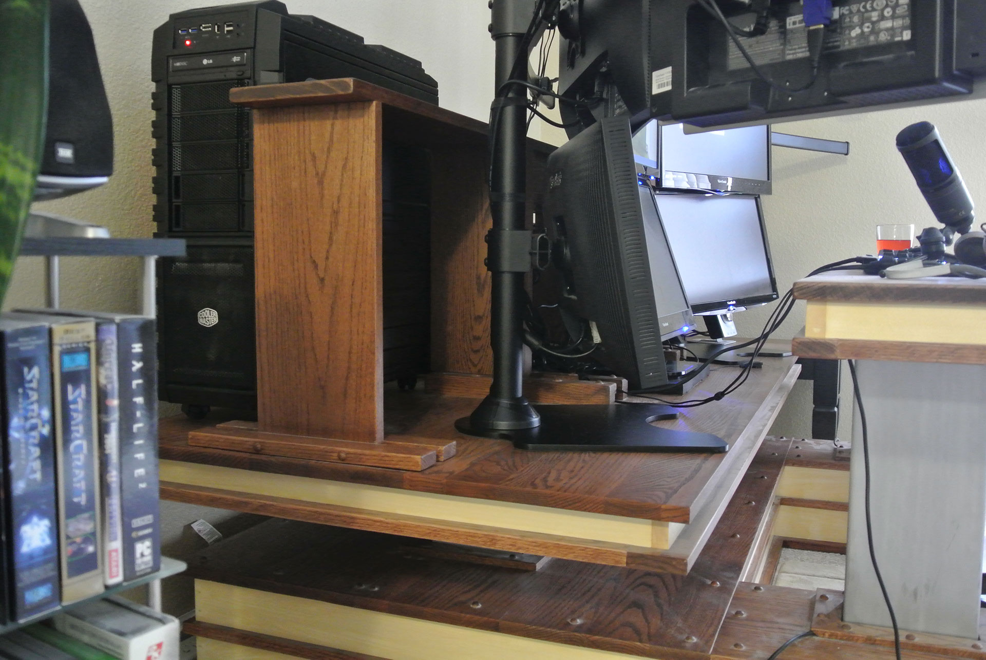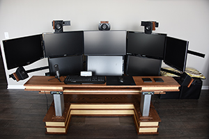 The desk is fully adjustable and designed to hold 9 or more monitors. The monitors are positioned on a shelf that can be manually adjusted to be closer or farther away from the user. The keyboard surface and monitor surface can be individually height adjusted using electric actuators and have enough range to be used as a sitting or standing desk.